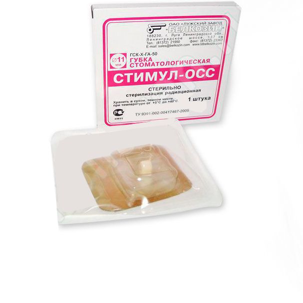Губка стоматологическая гемостатическая «Стимул Осс» является уникальной. Коллагеновая губка соприкасаясь с раневой поверхностью, вызывает стимуляцию роста соединительной ткани, т.е. заживление раны.