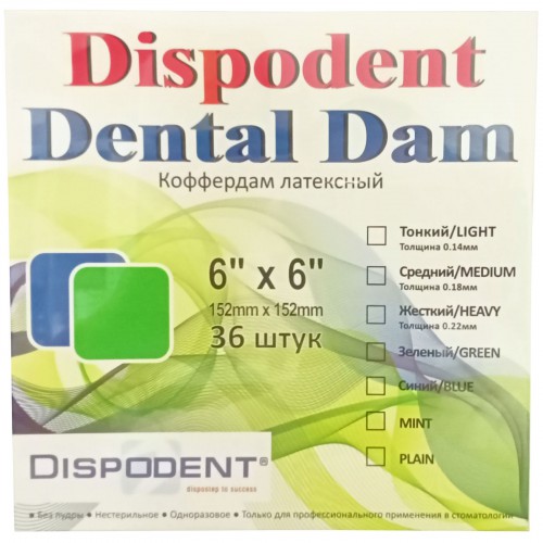 Завеса латексная Dispodent Dental Dam зеленого цвета, толщина 0,18 мм (средний), размер 152мм х 152мм 36 листов