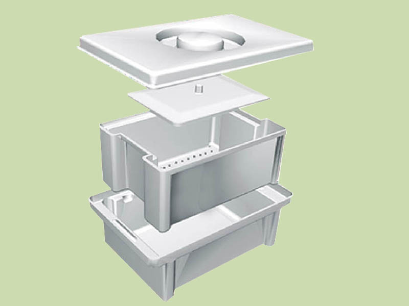 В верхней части корпуса имеются бортики для плотного прилегания крышки и удобства переноски емкости и выемки для устойчивой установки поддона при стекании раствора.