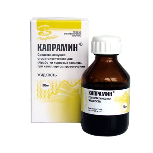 Капрамин. Применяется как гемостатическое средство при капиллярном кровотечении из десны, для обработки зубных лунок и после прямого снятия слепков, для ретракции десны, при снятии камней, а также для обработки корневых каналов при кровотечении из канала. Гемостатическое действие основного компонента - алюминия хлористого - многократно усиливает входящий в состав препарата центимониум бромид, который обладает бактерицидными свойствами. Не токсичен, прост в применении, не вызывает изменения цвета придесенных и зубных тканей, легко смывается струей воды. Упаковка: флакон с жидкостью 30 мл