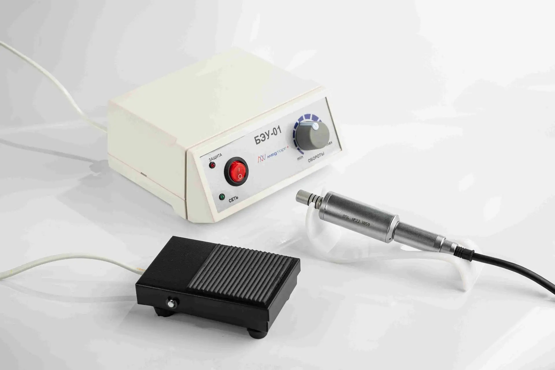 В комплект входит БЭУ-01 220 В, микромотора ДП-3 (скорость вращения 100-30000 ), кабель для подключения, микромотора, ножная педаль, подставка