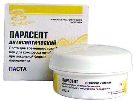 Парасепт антисептический. Применяется в виде лечебного компресса при язвенно-некротическом гингивите, хроническом пародонтите, при пародонтальных абсцессах, после хирургических вмешательств на пародонте, а также для временного пломбирования зубов. Представляет собой безэвгенольную пластичную пасту, на основе порошка цинксульфатного цемента и биосовместимого волокнистого наполнителя. Лечебное действие пасты обусловлено наличием в ее составе метронидазола, активного в отношении грамположительных, грамотрицательных и анаэробных бактерий. Антисептический эффективно действует на патогенную флору, останавливая воспалительный процесс