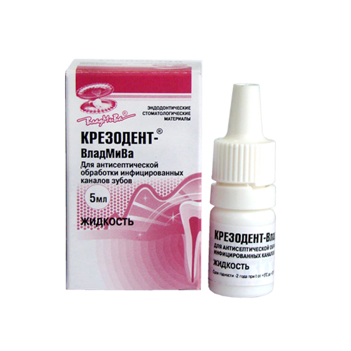 Крезодент- жидкость. Предназначена для антисептической обработки инфицированных и труднопроходимых каналов. Применяется при эндодонтических вмешательствах в качестве активного антисептика местного действия. Содержит: хлорфенол — активное бактерицидное вещество; камфору, обладающую антисептическими и седативными свойствами, а также смягчающую действие фенолов; дексаметазон (0,1%) — кортикостероид снижающий болезненность периапикальных реакций, оказывающий сильное противовоспалительное и антиаллергическое действие. Не раздражает периапикальные ткани при условии несмешивания его с другими веществами. Благодаря низкому коэффициенту поверхностного натяжения, препарат летуч и быстро проникает в зубные канальца, продлевая бактерицидный и фунгицидный эффект. Не теряет своих свойств при контакте с кровью, сывороткой и белками. Упаковка 5 мл.