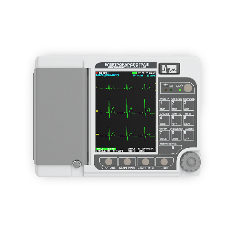 Электрокардиограф предназначен для проведения электрокардиографических обследований по типовым методикам Министерства Здравоохранения РФ: В отделениях функциональной диагностики, кардиологии и интенсивной терапии стационаров; В кабинетах функциональной диагностики поликлиник и медикосанитарных частей; В автомобилях скорой медицинской помощи с возможностью беспроводной gsm передачи экг на удаленный кардиопульт; В частной медицинской практике. • Возможность одновременного просмотра 3,4,6 или 12 отведений ЭКГ на графическом цветном TFT дисплее и печать отведений в том же масштабе на принтере • Автоматический старт записи при обнаружении аритмии и продление печати позволяет экономить бумагу • Возможность одновременной печати 12 отведений и протокола обследования на внешнем лазерном принтере на бумаге формата А4 • Возможность проверки кабеля ЭКГ в составе электрокардиографа • Автоматический анализ ЭКГ в базовом комплекте и возможность получения синдромальных заключений (опция) • Режим проб (периодическая печать), время наблюдения до 3 часов, интервал печати от 1 до 90 мин. • Возможность одновременного и последовательного съема ЭКГ • Возможность снятия ЭКГ в ручном режиме с любым количеством электродов • Возможность быстрого управления прибором 14-ю клавишами прямого действия • Режим записи ритма одного или трех отведений позволяет наблюдать изменения ритма сердца • Комбинированная алфавитно-цифровая и функциональная пленочная клавиатура • Наличие манипулятора упрощает работу с прибором • Настройка всех параметров под каждого пользователя (10 заданных пользовательских профилей) • Возможность подключения стандартной клавиатуры для упрощения ввода данных (опция) • Печать усредненных (или типовых) кардиокомплексов с метками • Вывод информации на ПК с программными модулями регистрации и архивации ЭКГ «ЭКГ Ревю» или анализа ЭКГ покоя «armasoft-12-Cardio», в реальном времени с внутренней памяти и через внешнюю Flash карту • Передача по каналу GSM на центральный пульт (опция) • Возможность отключения и регулировки громкости звуковых сигналов R-зубца ЭКГ и клавиатуры • Возможность обнаружения сигналов кардиостимулятора и защита от дефибрилляции • Возможность работы в составе комплекса для проведения нагрузочных проб • Возможность снятия ЭКГ с детей (опция) Особенности Встроенный автоматический анализ ЭКГ в базовом комплекте; Режим записи и печати одного или трех отведений ритма; Возможность одновременного просмотра 12 отведений ЭКГ Автоматический старт записи при обнаружении аритмии; Режим проб (периодическая печать); Настройка всех параметров для каждого пользователя (10 заданных пользовательских профилей); Подключение внешнего лазерного принтера, клавиатуры, сканера штрих-кодов (опция) и вывод информации на ПК через встроенный USB порт Расширенные возможности анализа с синдромальными заключениями с встроенным ПО анализа ЭКГ покоя «ArMaSoft» (опция); Возможность снятия ЭКГ с детей (опция); Возможность передачи ЭКГ на удаленный пульт по каналу GSM без использования компьютера и прием информации с помощью программы «ArMaSoft12-Tele» (опция) Возможность проверки кабеля ЭКГ в составе электрокардиографа; Одновременная печать 12 отведений поперек бумаги;