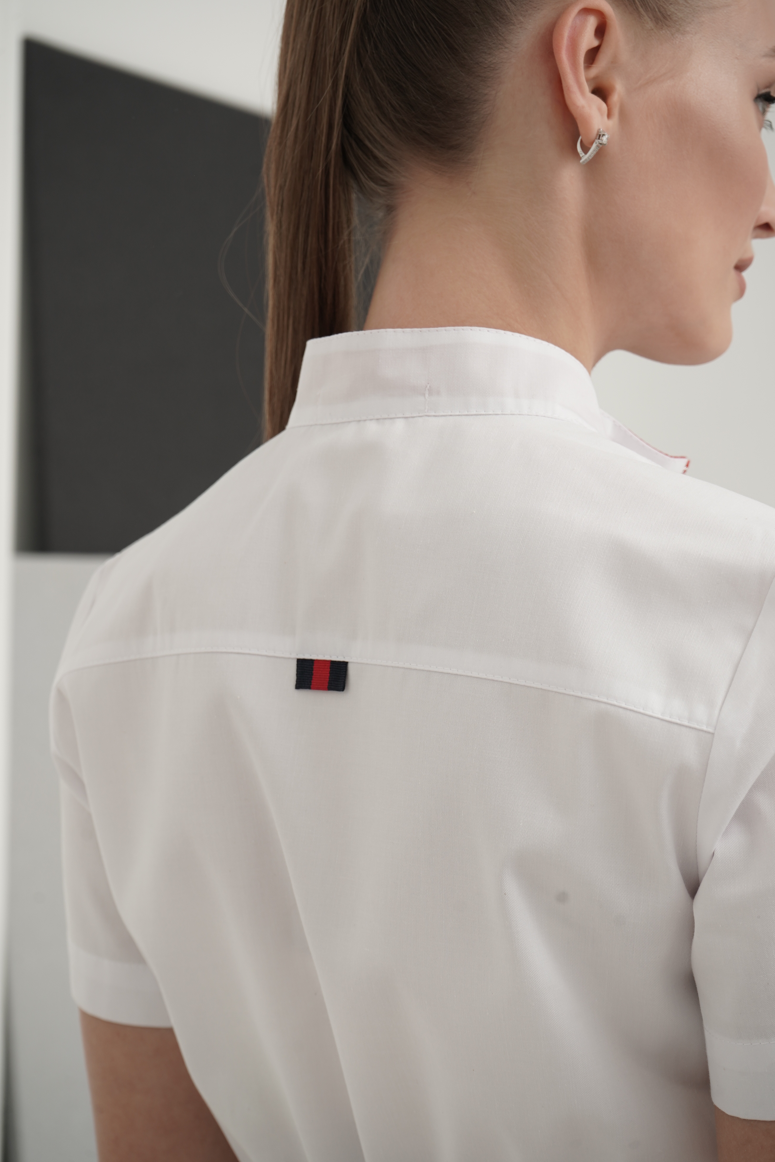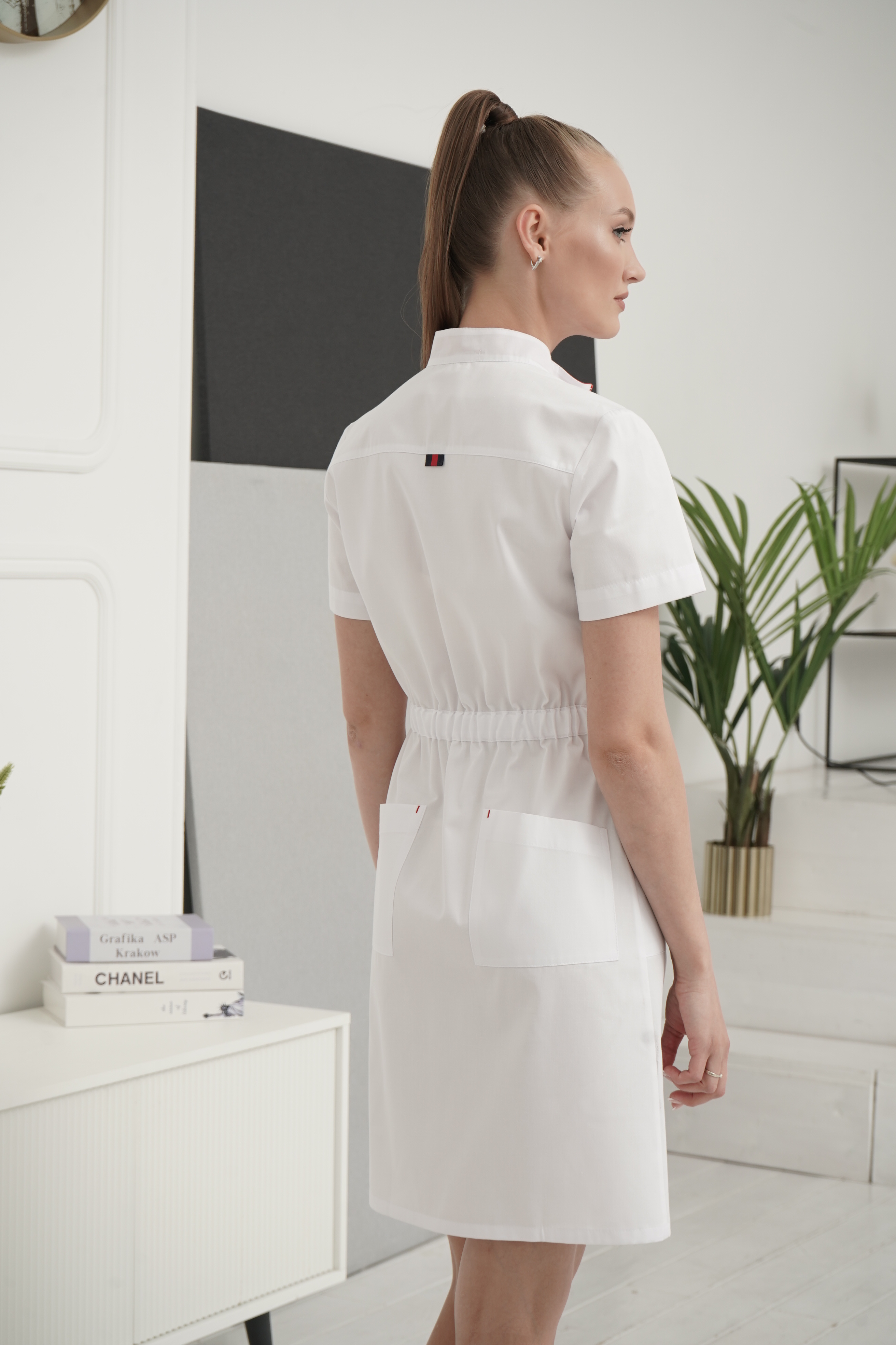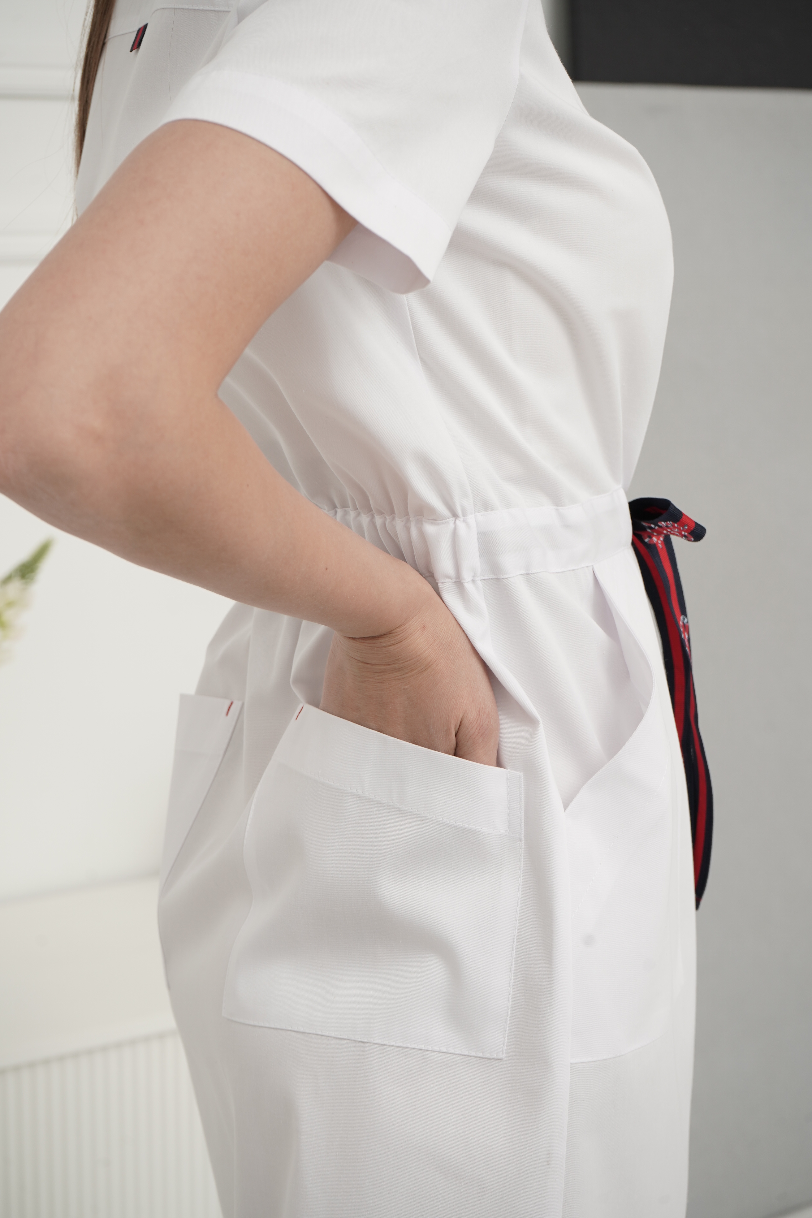 Медицинский женский халат из белой ткани сатори, длиной выше колен; прямого силуэта. Идеальная униформа для сотрудников в сфере медицины и косметологии. Белый цвет халата прекрасно сочетается со стильным дизайном. Короткий рукав дает возможность свободного движения, позволяя выполнять свои профессиональные обязанности с комфортом. Он идеально подходит как для врачей, так и для косметологов, подчеркивает стиль и элегантность. Плотный и износоустойчивый материал халата гарантирует долговечность и стойкость к повреждениям. Модный дизайн и современный фасон делают этот халат непременно стильным аксессуаром для тех, кто ценит качество и удобство. Больше не нужно выбирать между комфортом и стилем – медицинский халат от Linesta объединяет в себе все лучшие качества и отвечает требованиям к медицинской одежде.