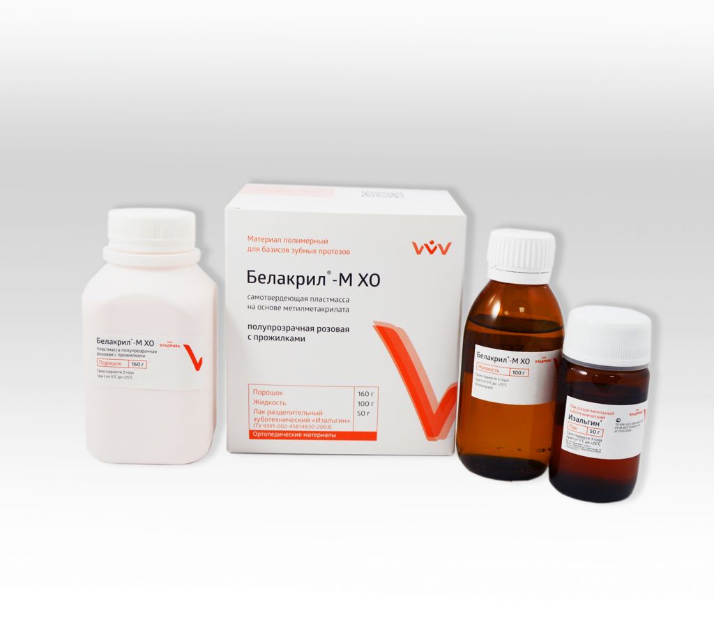 Базисные материалы «Белакрил» выпускаются в виде двух компонентов - порошка, содержащего полиэфиры метакриловой кислоты, катализатор реакции полимеризации перекись бензоила, и жидкости, содержащей мономер метилметакрилат (М) и/или мономер этилметакрилат (Э), после смешивания порошка с жидкостью образуется полимер, твердеющий при нагревании (горячего отверждения) - ГО или без нагревания (самотвердеющий) - ХО. Базисные материалы «Белакрил» отличает высокая технологичность, простота и быстрота изготовления изделий, имеющих высокое качество, функциональную долговечность, натуральный внешний вид и биосовместимость.