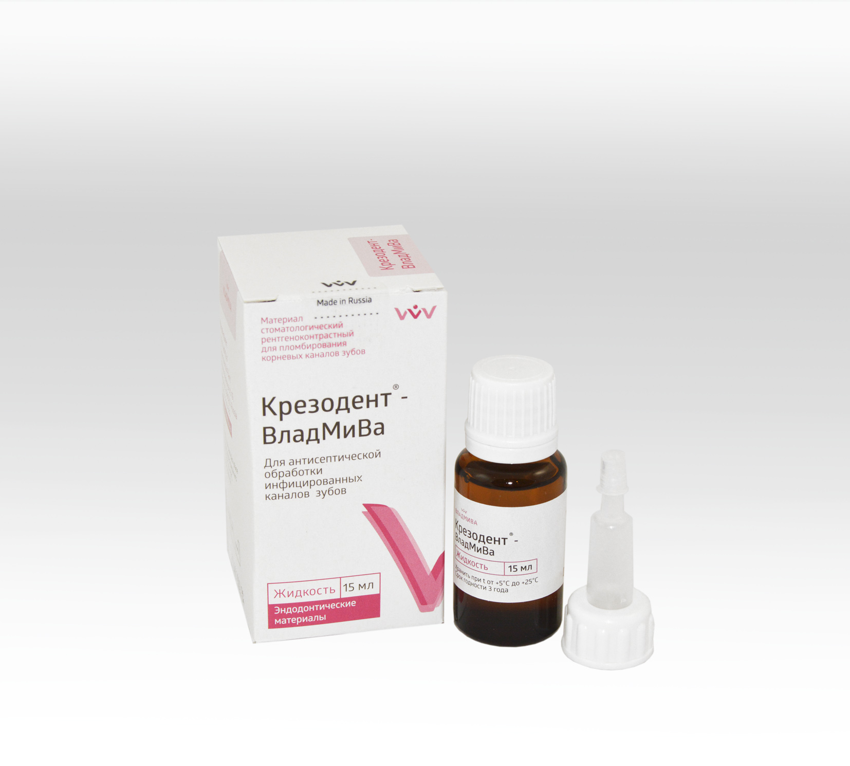 Крезодент- жидкость. Предназначена для антисептической обработки инфицированных и труднопроходимых каналов. Применяется при эндодонтических вмешательствах в качестве активного антисептика местного действия. Содержит: хлорфенол — активное бактерицидное вещество; камфору, обладающую антисептическими и седативными свойствами, а также смягчающую действие фенолов; дексаметазон (0,1%) — кортикостероид снижающий болезненность периапикальных реакций, оказывающий сильное противовоспалительное и антиаллергическое действие. Не раздражает периапикальные ткани при условии несмешивания его с другими веществами. Благодаря низкому коэффициенту поверхностного натяжения, препарат летуч и быстро проникает в зубные канальца, продлевая бактерицидный и фунгицидный эффект. Не теряет своих свойств при контакте с кровью, сывороткой и белками. Упаковка 15 мл.