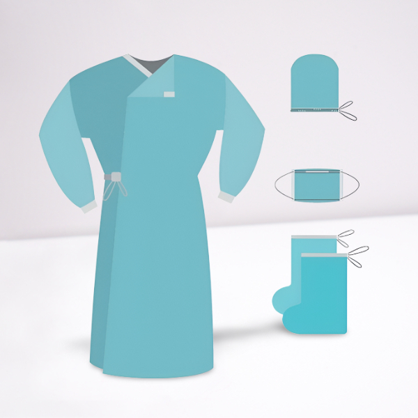 Комплект одежды хирургической одноразовый стерильный "АК №26": халат, шапочка, маска, бахилы высокие
