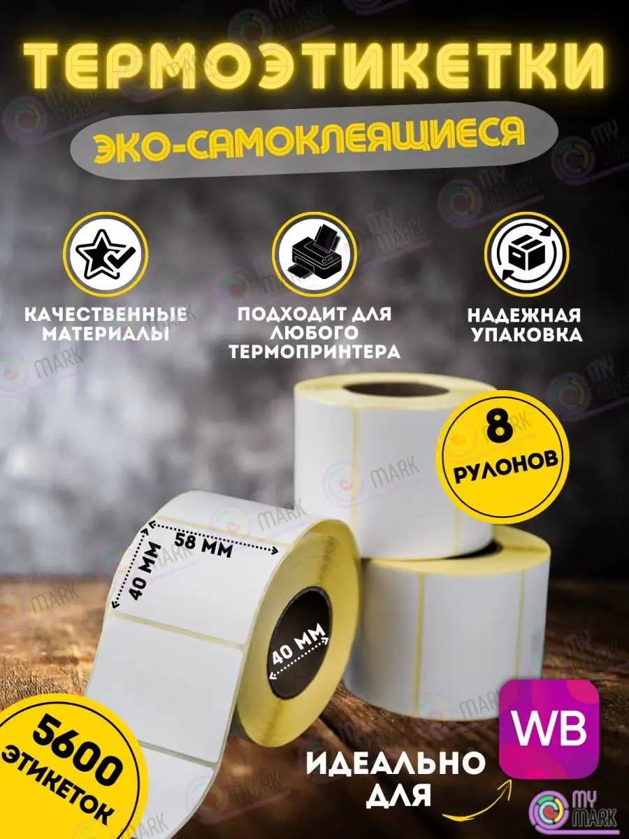 Белые этикетки 58х40 мм. Намотка 700 штук из термочувствительной бумаги ЭКО в рулонах на самоклеящейся основе. Печать осуществляется методом прямой термопечати на термо и термотрансферных принтерах этикеток или печатающих весах (без использования красящей ленты). Данный тип этикеток является наиболее популярным из-за простоты использования (для печати требуется только принтер) и низкой стоимости. Термоэтикетки 58*40 ЭКО это: бумага без защитного покрытия плотностью 65 г/кв.м. Эти этикетки для печати отличаются высокой контрастностью изображения и хорошей читабельностью и считываемостью штрих-кода. Клеящий слой обеспечивает прекрасное прилипание на широкий спектр поверхностей, включая неровные, слегка шершавые и изогнутые. Для маркировки на OZON; YYandex Market, а также в торговле, на любых складах и в весах. Клеевой слой выдерживает механические воздействия и не отрывается при эксплуатации. Этикетки отлично клеятся к пластику, металлу, бумаге, картону и дереву. Их можно использовать даже на неровных поверхностях. Для печати необходим принтер для этикеток. Помимо печати, этикетки также можно использовать для ручного нанесения надписей с помощью ручки, карандаша или фломастера. Этикетки незаменимы при переезде или для организации хранения вещей в квартире. Чем больше партия, тем выгоднее цена за 1 рулон!