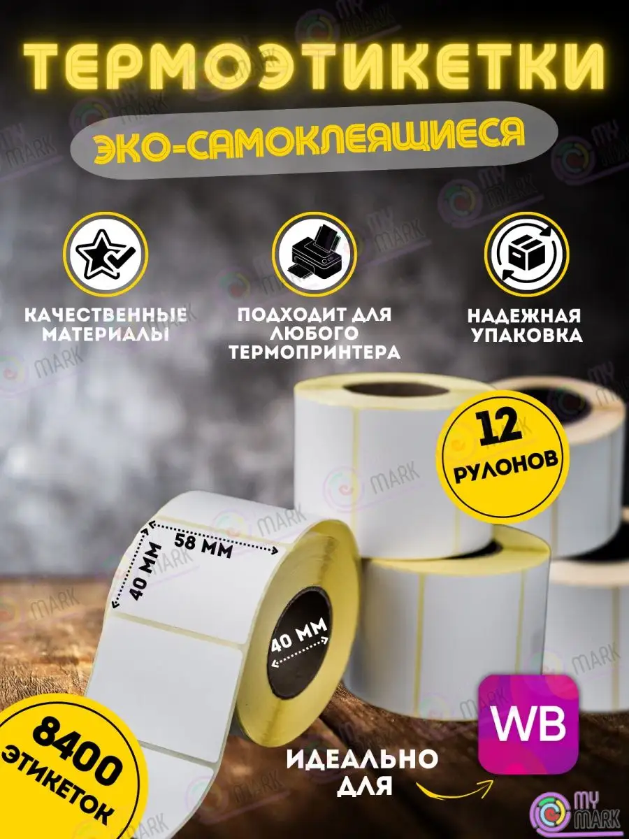 Белые этикетки 58х40 мм. Намотка 700 штук из термочувствительной бумаги ЭКО в рулонах на самоклеящейся основе. Печать осуществляется методом прямой термопечати на термо и термотрансферных принтерах этикеток или печатающих весах (без использования красящей ленты). Данный тип этикеток является наиболее популярным из-за простоты использования (для печати требуется только принтер) и низкой стоимости. Термоэтикетки 58*40 ЭКО это: бумага без защитного покрытия плотностью 65 г/кв.м. Эти этикетки для печати отличаются высокой контрастностью изображения и хорошей читабельностью и считываемостью штрих-кода. Клеящий слой обеспечивает прекрасное прилипание на широкий спектр поверхностей, включая неровные, слегка шершавые и изогнутые. Для маркировки на OZON; YYandex Market, а также в торговле, на любых складах и в весах. Клеевой слой выдерживает механические воздействия и не отрывается при эксплуатации. Этикетки отлично клеятся к пластику, металлу, бумаге, картону и дереву. Их можно использовать даже на неровных поверхностях. Для печати необходим принтер для этикеток. Помимо печати, этикетки также можно использовать для ручного нанесения надписей с помощью ручки, карандаша или фломастера. Этикетки незаменимы при переезде или для организации хранения вещей в квартире. Чем больше партия, тем выгоднее цена за 1 рулон!