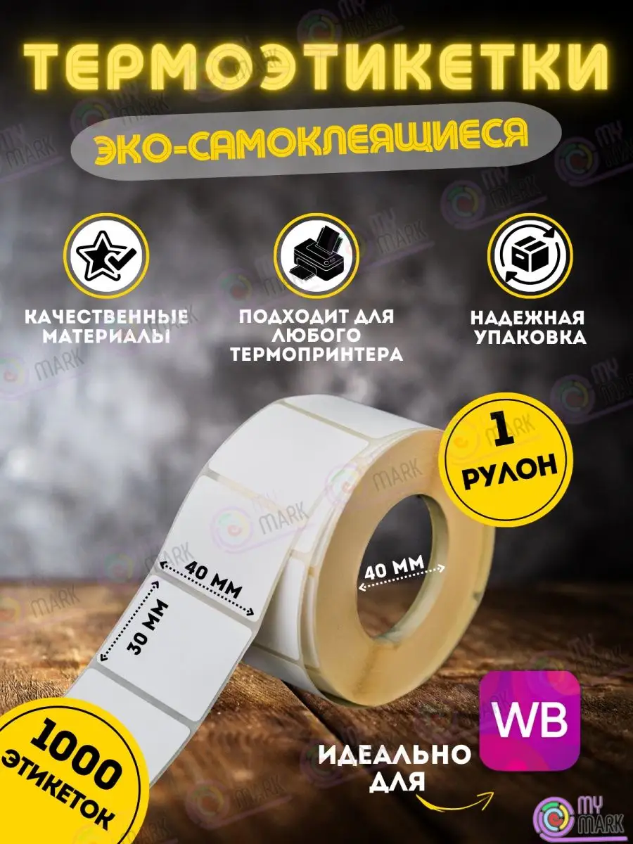 Самоклеящиеся термоэтикетки ЭКО для печати на термопринтере. Размер 40 х 30 мм. втулка 40 мм. в рулоне 1000 этикеток. Этикетки для термопринтера изготовлены из качественного сырья, имеют белую клеящеюся термобумагу! Подходит для маркетплейсов Wildberries (Вайлдберриз), Ozon (Озон), а также в торговле, на любых складах и в весах. Клеевой слой выдерживает механические воздействия и не отрывается при эксплуатации. Этикетки отлично клеются к пластику, металлу, бумаге, картону и дереву. Их можно использовать даже на неровных поверхностях. Помимо печати, этикетки также можно использовать для ручного нанесения надписей с помощью ручки, карандаша или фломастера. Этикетки для печати незаменимы при переезде или для организации хранения вещей в квартире. Чем больше партия, тем выгоднее цена за 1 рулон!