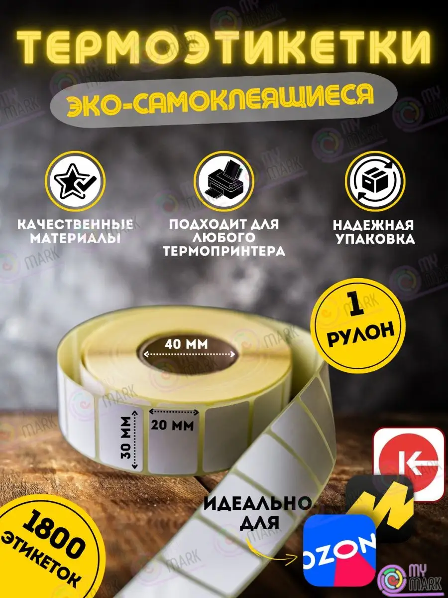 Термоэтикетки 30 х 20 мм. В одном рулоне 1800 этикеток. Белые этикетки самоклеящиеся из термочувствительной бумаги в рулонах на самоклеящейся основе. Печать осуществляется методом прямой термопечати на термо и термотрансферных принтерах этикеток (без использования красящей ленты). Данный тип этикеток является наиболее популярным из-за простоты использования (для печати требуется только принтер) . Термоэтикетки чувствительны к влаге (размывает изображение) и высокой температуре более 50С (этикетка темнеет, изображение тускнеет). Срок жизни такой этикетки до одного года при условии эксплуатации ее в нормальных условиях внутри помещений. Применяются на товарах и продуктах питания, в случаях, когда срок жизни этикетки ограничен сроком реализации.