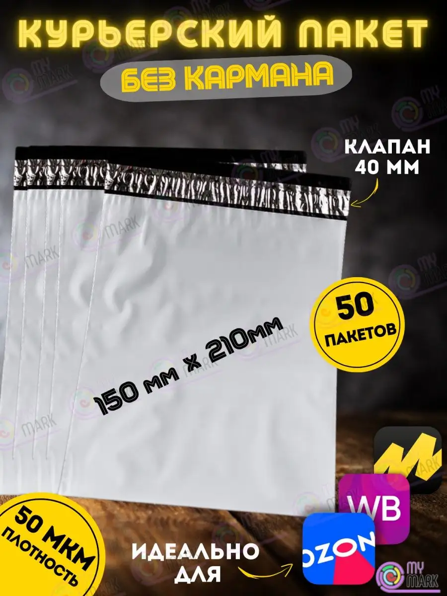 Цвет белый. Размер курьерского пакета 150х210. Склеевым клапаном 40 мм толщиной без кармана. 60 мкм. В комплектации 50 шт