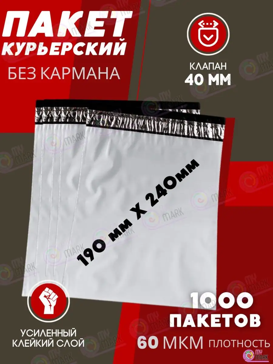 Курьерский пакет размером 190х240 с клеевым клапаном 40 мм толщиной 60 мкм подойдет для упаковки и отправки вещей бытового и промышленного назначения, например: изделий из текстиля, трикотажа, подарков, сувениров, ювелирных изделий, открыток, фотографий, предметов хозяйственного назначения, личной гигиены, аптечной продукции, семян, пряжи, канцелярских товаров и т.п. Пакеты с клеевым клапаном имеют 3 слоя непрозрачного полиэтилена: наружный белый, для нанесения необходимых надписей, внутренние черные, плотный светонепроницаемый полиэтилен. Кроме того, у пакета есть перманентный клей, который не позволит вскрыть упаковку не повредив поверхности одного или обоих слоев. Наши почтовые пакеты подходят для торговли на Wildberries, Ozon, Goods, Lamoda, Беру, СДЭК маркет, Яндекс маркет и других маркетплейсов. Если вы не нашли нужный размер, то просто кликните на название нашего бренда и получите доступ к полному списку всех размеров пакетов. Сейф пакеты с клеевым клапаном без кармана.