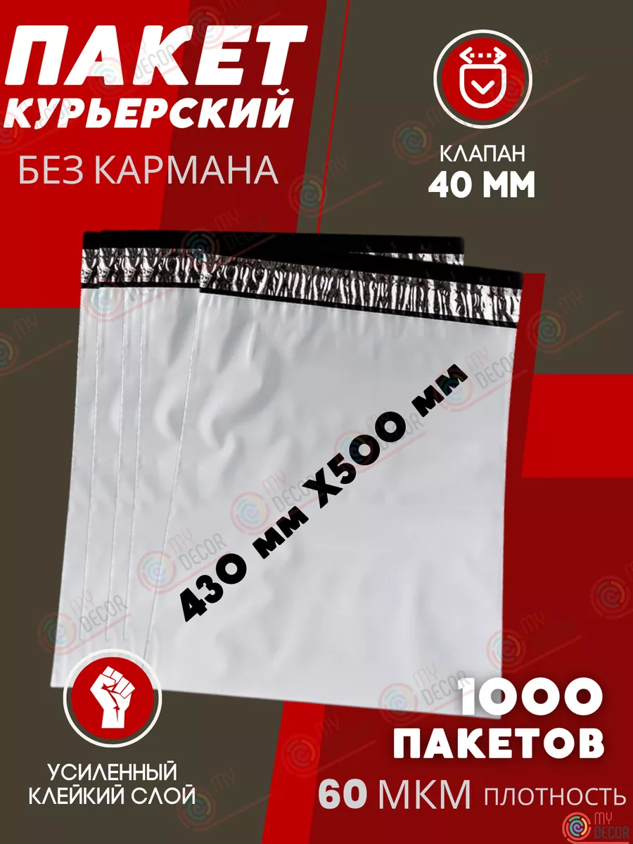 Курьерский пакет размером 430х500 с клеевым клапаном 40 мм толщиной 60 мкм подойдет для упаковки и отправки вещей бытового и промышленного назначения, например: изделий из текстиля, трикотажа, подарков, сувениров, ювелирных изделий, открыток, фотографий, предметов хозяйственного назначения, личной гигиены, аптечной продукции, семян, пряжи, канцелярских товаров и т.п. Пакеты с клеевым клапаном имеют 3 слоя непрозрачного полиэтилена: наружный белый, для нанесения необходимых надписей, внутренние черные, плотный светонепроницаемый полиэтилен. Кроме того, у пакета есть перманентный клей, который не позволит вскрыть упаковку не повредив поверхности одного или обоих слоев. Наши почтовые пакеты подходят для торговли на Wildberries, Ozon, Goods, Lamoda, Беру, СДЭК маркет, Яндекс маркет и других маркетплейсов. Если вы не нашли нужный размер, то просто кликните на название нашего бренда и получите доступ к полному списку всех размеров пакетов. пакеты с клеевым клапаном без кармана.