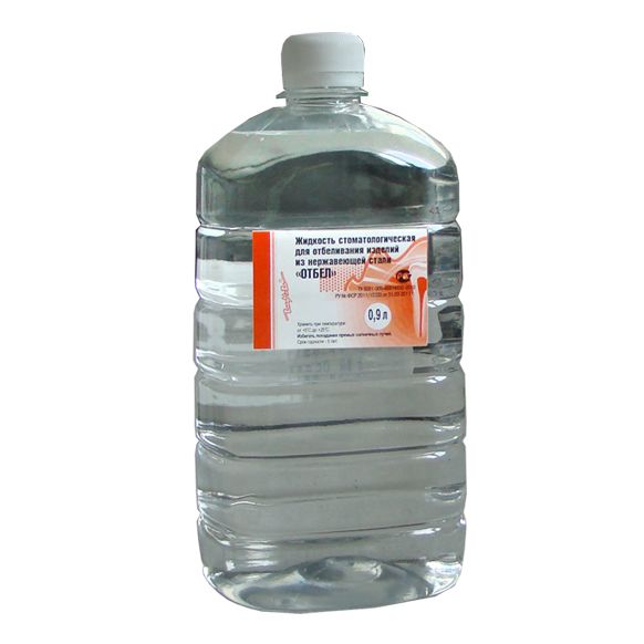 Отбеливатель для нержавеющей стали ОТБЕЛ, 0,9л (ВладМиВа) Раствор, состоящий из смеси разбавленных соляной и азотной кислот, предназначен для снятия с нержавеющей стали окисной пленки, образующейся при термической обработке стальных протезов.