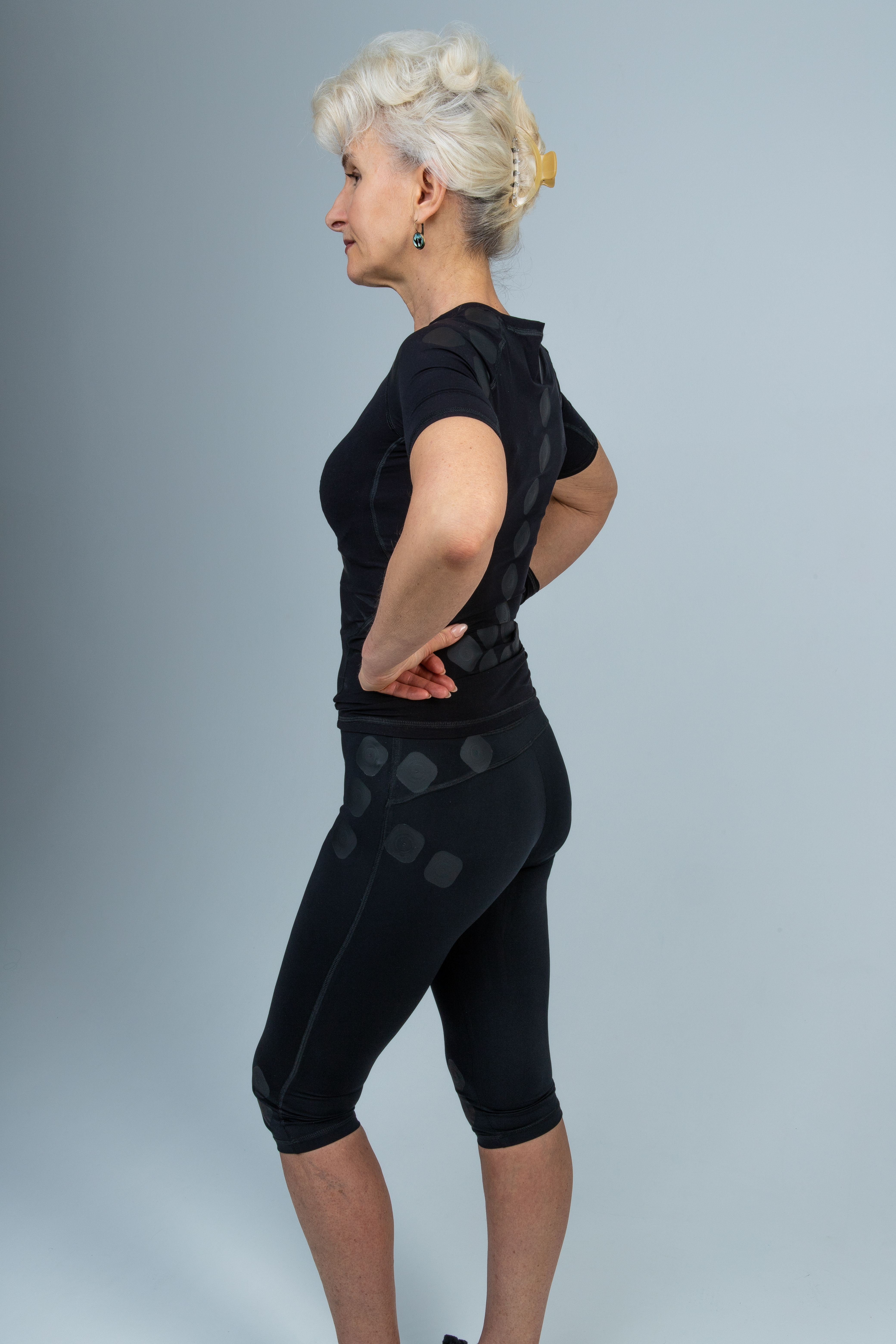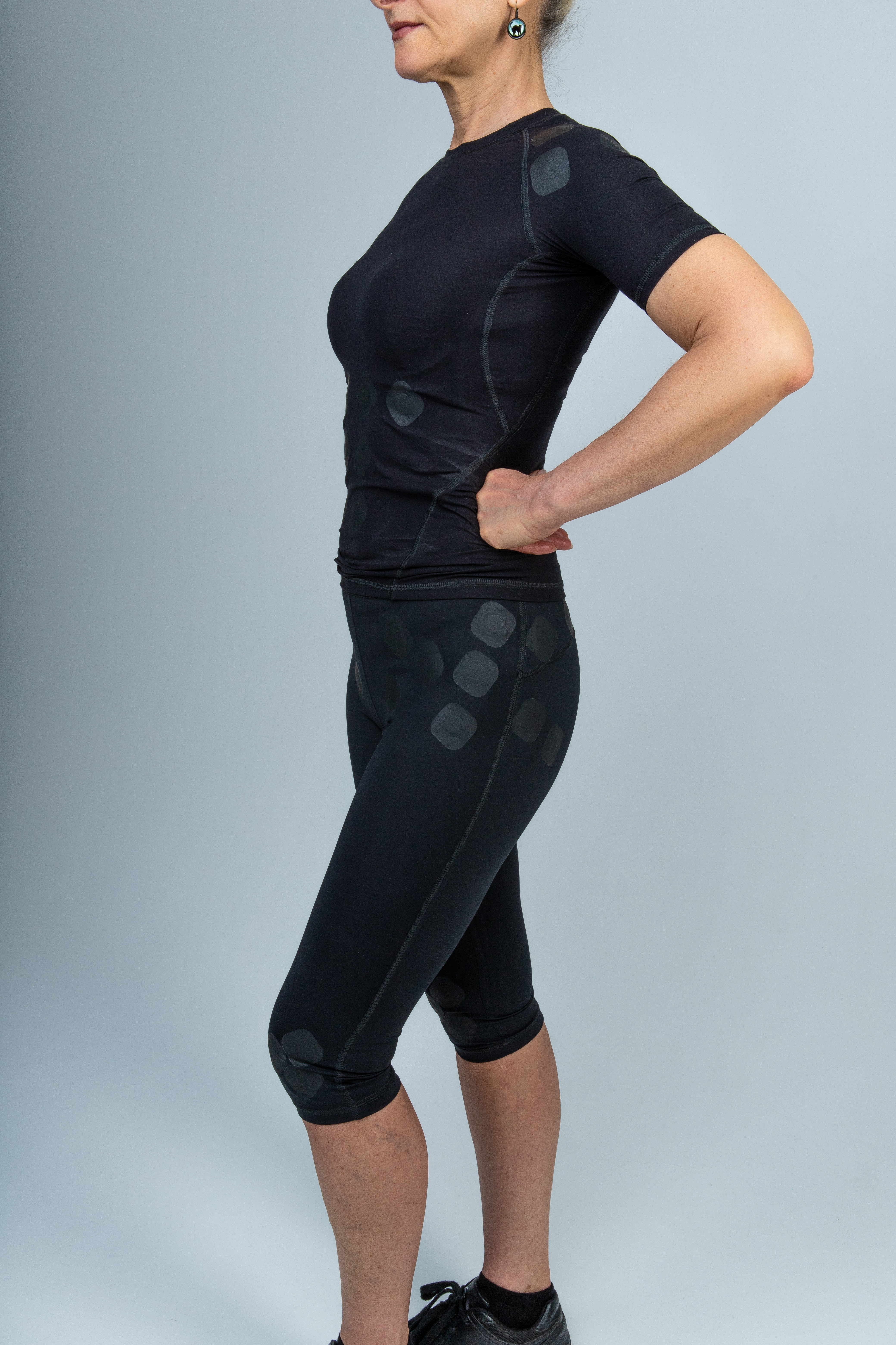 Для тазобедренных суставов. Увеличение кровоснабжения в тазобедренных суставах способствует снижению воспалительных процессов, ускорению регенерации тканей и уменьшению болевого синдрома, особенно при дегенеративных заболеваниях суставов, таких как артроз и артрит. Это также способствует увеличению диапазона движения в ногах, что, в свою очередь, повышает мобильность и функциональное состояние. Зоны: Подвздошная и поясничная мышцы: За счет улучшения кровообращения в данных мышцах, уменьшаются болевые ощущения в пояснице и тазу (ноющие, тянущие), улучшается амплитуда движения в поясничном отделе и тазобедренных суставах, что способствует быстрому восстановлению после тяжелых физических нагрузок и длительного пребывания в статических позах (стояние, сидение). Они также сокращают время восстановления после травм и операций на поясничном отделе позвоночника и тазобедренных суставах; Средняя и малая ягодичные мышцы: Улучшение кровообращения в данных мышцах способствует уменьшению болевых ощущений, особенно тянущих болей в пояснице и бедре при сидении и стоянии, а также улучшает подвижность бедра. Длительное воздействие, например, во время ночного сна, придает ощущение легкости в ногах и пояснице. Доты способствуют восстановлению после операций на тазобедренных суставах и травмах, а также при неврологических заболеваниях поясничного отдела позвоночника. Улучшают стабильность при ходьбе за счет положительного влияния на среднюю и малую ягодичные мышцы (стабилизаторы бедра), тем самым благоприятно влияя на коленный сустав; Большая ягодичная мышца: Воздействие Дотами на данную мышцу улучшает мышечный контроль и стабилизирует позвоночник, так как большая ягодичная мышца является стабилизатором позвоночника. Снижается боль в задней поверхности бедра. Увеличивается амплитуда шага, улучшается кровообращение малого таза; Большая подвздошная и поясничная мышцы (подвздошно-поясничная): Улучшение кровообращения в данных мышцах уменьшает болевые ощущения в пояснице и тазу (ноющие, тянущие), улучшает амплитуду движения в поясничном отделе и тазобедренных суставах, способствует более быстрому восстановлению после тяжелых физических нагрузок и длительных статических позиций (стояние, сидение). Уменьшается время восстановления после травм и операций на поясничном отделе позвоночника и тазобедренных суставах. Также снижаются боли и улучшается амплитуда при сгибании бедра; Напрягатель большой фасции бедра и илиотибиальный тракт: Влияние Дотов на структуру тканей и улучшение кровообращения снижают боль по внешней боковой поверхности бедра, а влияние на илиотибиальный тракт уменьшает боль в области боковой поверхности коленного сустава; Прямая мышца бедра: Доты снижают болевые ощущения в передней поверхности бедра, улучшают подвижность коленного сустава, особенно при разгибании, и снижают болевые ощущения в коленном суставе; Портняжная мышца : Доты снижают боль в области внутренней поверхности бедра и внутренней поверхности коленного сустава. Ношение тайтсев повышает эластичность внутренней поверхности бедра.