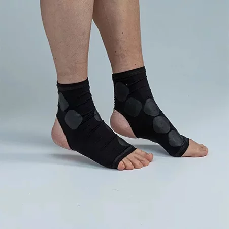 Связки и капсула сустава расположены очень близко к коже, что крайне положительно сказывается на эффективности работы Дотов. Воздействие Дотов на связки голеностопного сустава происходит быстрее, и пользователь ощущает облегчение при травмах или недомоганиях в более короткие сроки. Доты расположены в областях сустава, наиболее подверженного травмам и перегрузкам, что способствует профилактике негативных процессов, сокращению сроков восстановления после травм и профилактике травм за счет улучшения кровообращения и моторного контроля в данной области. Зоны: Доты расположены в областях, где проходят артерии, вены и лимфатические каналы лодыжки и стопы, которые обеспечивают питание связочного аппарата и нервной ткани: Данная область подвержена наибольшим нагрузкам и травмам. Доты улучшают кровообращение и лимфоток, что способствует повышению эластичности связочного аппарата и снижает риск травматизации при неправильном положении стопы, приземлениях или падениях. Рефлекторное воздействие Дотов на нервную систему и эластичную ткань позволяет лучше контролировать сустав в пространстве, что обеспечивает правильную биомеханику данной области и всей цепочки суставов (коленного, тазобедренного), обеспечивая соосность (конгруэнтность), т.е. правильное положение костных структур относительно друг друга. Эффект голеностопа SportDots улучшает биомеханику движения ноги, оптимизируя движение и снижая нагрузку на все суставы, включая позвоночник, а также сохраняя больше энергии при движении; Доты расположены на медиальной (внутренней) поверхности стопы, помимо всех эффектов описанных выше, в данной области сосредоточены сухожилия и связки мыщц-сгибателей стопы: Воздействие Дотов на данную область улучшает подвижность всей стопы, что обеспечивает более мягкое приземление на пятку при беге и ходьбе. Голеностоп SportDots может применяться не только при восстановлении после травм или их профилактике, но и в комплексном лечении и профилактике плоскостопия, в том числе у детей. Улучшение кровообращения в важных рефлекторных зонах также способствует профилактике возникновения «пяточной шпоры» за счет правильного положения стопы в пространстве и хорошего кровоснабжения. Данное заболевание проходит в более короткие сроки, так как SportDots влияет не на симптом, а на причину проблемы в стопе.