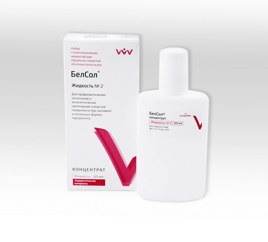 Жидкость №2 (концентрат) — для профилактических полосканий и антисептических промываний слизистой поверхности при гингивите и начальных формах пародонтита, а также для промывания инфицированных каналов зубов и медикаментозной обработки кариозных полостей перед процедурой пломбирования;