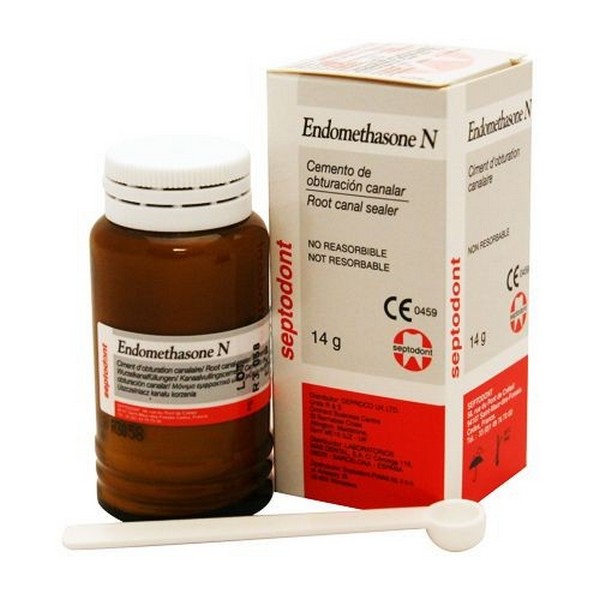 Endomethasone N - цемент для пломбирования корневых каналов. Применяется для окончательного пломбирования корневых каналов с использованием гуттаперчевых штифтов. Пасты для пломбирования корневых каналов должны прекрасно выполнять свою пломбирующую функцию, не рассасываться после отверждения и не подвергаться усадке со временем. Их антисептическое и противовоспалительное действие должно продолжаться в течение нескольких часов после введения в каналы. Эти пасты должны быть рентгеноконтрастны и легко вводиться в канал. Состав: ацетат гидрокортизона не менее - 1,00 г, Наполнители: дийодотимол, сульфат бария, оксид цинка, стеарат магния, количество достаточное для 100 г. Упаковка включает: 1 флакон, содержащий 14 г порошка
