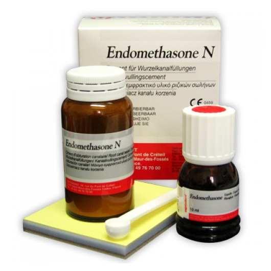 Endomethasone N - цемент для пломбирования корневых каналов. Применяется для окончательного пломбирования корневых каналов с использованием гуттаперчевых штифтов. Пасты для пломбирования корневых каналов должны прекрасно выполнять свою пломбирующую функцию, не рассасываться после отверждения и не подвергаться усадке со временем. Их антисептическое и противовоспалительное действие должно продолжаться в течение нескольких часов после введения в каналы. Эти пасты должны быть рентгеноконтрастны и легко вводиться в канал. Состав: ацетат гидрокортизона не менее - 1,00 г, Наполнители: дийодотимол, сульфат бария, оксид цинка, стеарат магния, количество достаточное для 100 г. Упаковка включает: 1 флакон, содержащий 14 г порошка. 1 флакон, содержащий 10 мл жидкости.