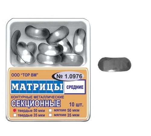 Матрицы контурные секционные металлические 1.0976 средние, твердые для разделения аппроксимальных поверхностей соседних зубов при реставрации II типа. Объемные, вогнутые, сформованы из специальной коррозионностойкой стали. Толщина 50 мкм. Упаковка 10 шт