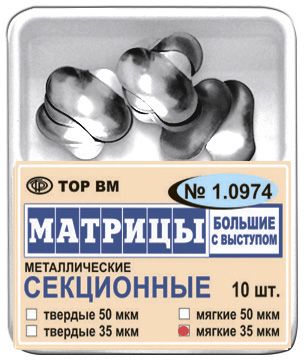 Матрицы контурные секционные металлические 1.0974 большие с выступом для разделения аппроксимальных поверхностей соседних зубов при реставрации II типа. Объемные, вогнутые, сформованы из специальной коррозионностойкой стали. Твердые, толщина 50 мкм. Упаковка 10 шт.