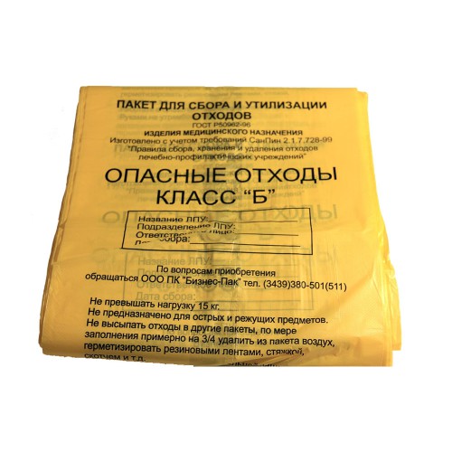 Одноразовые герметичные пакеты для отходов класса Б, цвет желтый, на 30 литров обеспечивают возможность безопасного сбора в них медицинских отходов имеют двойную спайку на дне, предусмотренны специальные окна для маркировки, также дополнительно можно приобрести специальные стяжки, которые эффективно герметизируют пакеты после их заполнения.