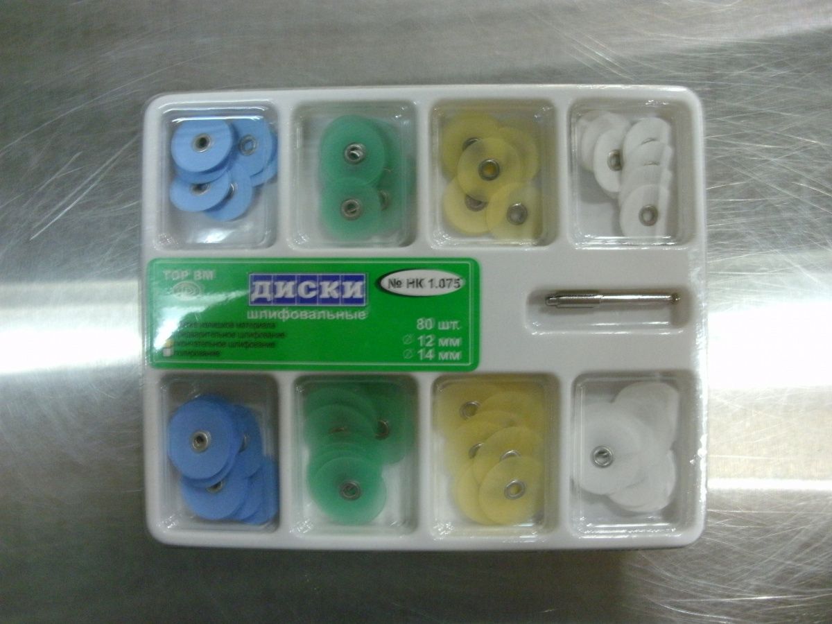 Наборы дисков шлифовальных стоматологических четырехдисперсной абразивности ДШ «ТОР ВМ» по ТУ 9391-001-49962851-00 в следующих исполнениях: диски шлифовальные с металлической втулкой и дискодержатели для них (1.075)