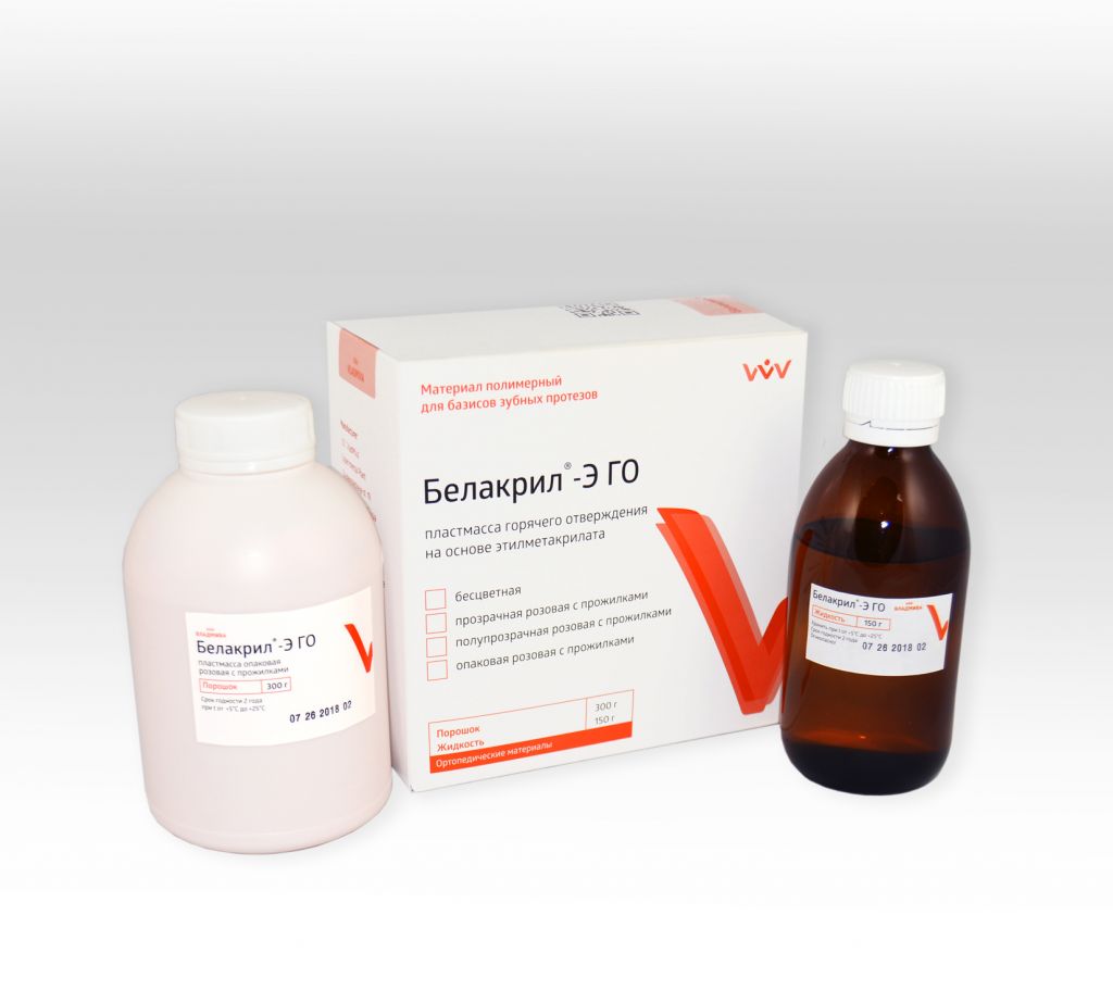 Базисные материалы «Белакрил» выпускаются в виде двух компонентов - порошка, содержащего полиэфиры метакриловой кислоты, катализатор реакции полимеризации перекись бензоила, и жидкости, содержащей мономер метилметакрилат (М) и/или мономер этилметакрилат (Э), после смешивания порошка с жидкостью образуется полимер, твердеющий при нагревании (горячего отверждения) - ГО или без нагревания (самотвердеющий) - ХО. Базисные материалы «Белакрил» отличает высокая технологичность, простота и быстрота изготовления изделий, имеющих высокое качество, функциональную долговечность, натуральный внешний вид и биосовместимость.